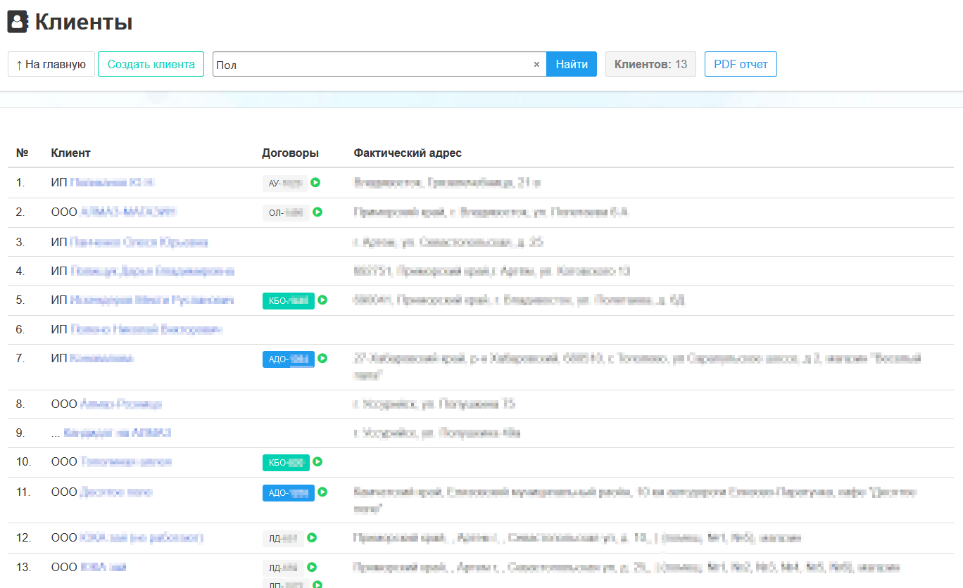 Повседневная работа менеджера компании будет происходить в реестре клиентов, где есть общий список с основной информацией, поиск по названию клиента и по его фактическому адресу. Реквизиты, основные атрибуты и подробности о клиенте доступны из его карточки.