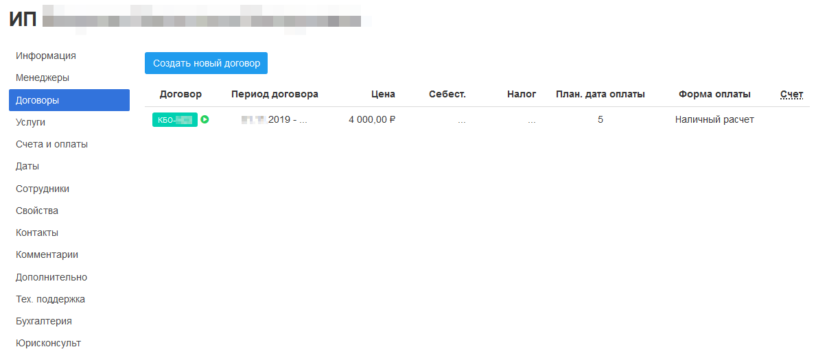 В карточке клиента менеджер указывает основную информацию и реквизиты, управляет договорами, услугами и счетами. Из карточки клиента можно посмотреть историю и ход текущих обращений в тех поддержку, в бухгалтерию или в юридический отдел.