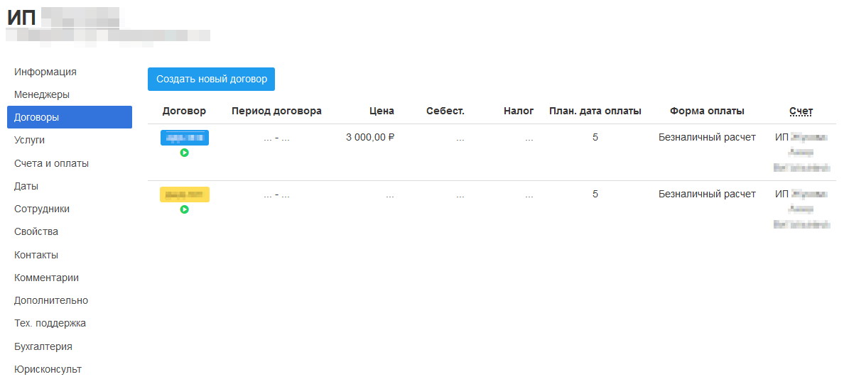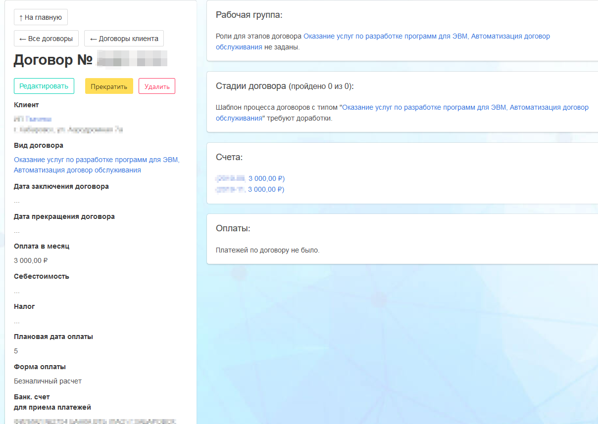 Рис. 16. Два действующих договора клиента, безналичный расчетЛюбой договор можно изучить подробнее, отредактировать или завершить. Здесь же можно сформировать рабочую группу исполнителей, увидеть историю пройденных этапов, увидеть выставленные счета на оплату и сами оплаты.