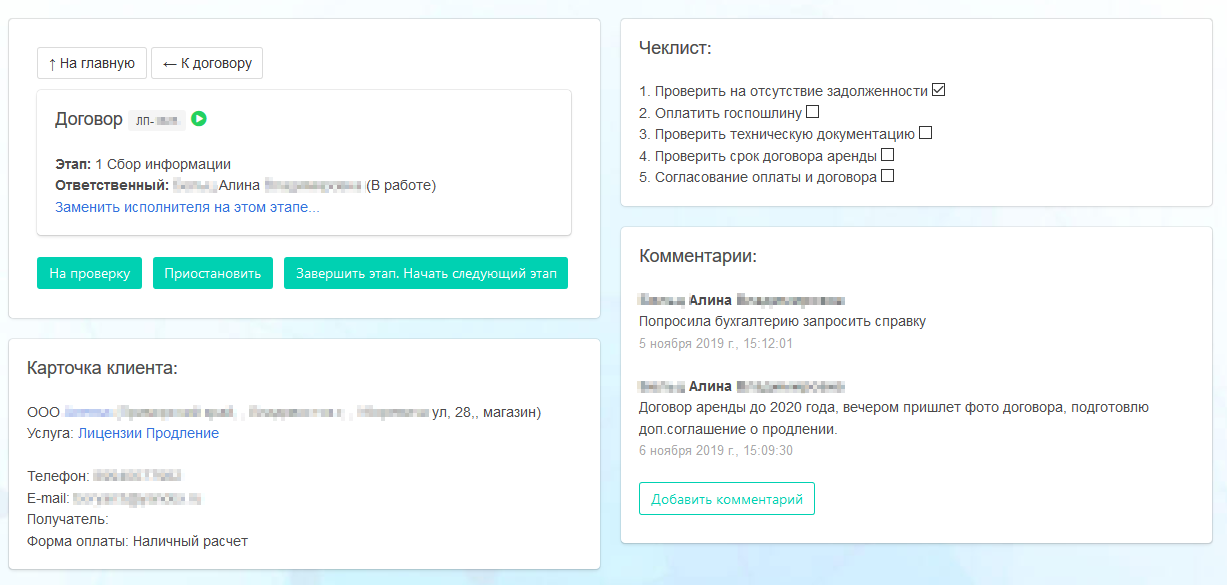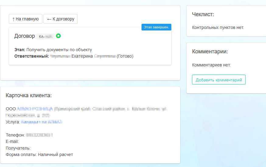 Рис. 17. Подробности договора на оказание услуг, без бизнес процесса, с выставленными счетами, без оплатИз истории пройденных этапов можно перейти в подробности интересующего элемента. Информация о договоре, чек лист этапа бизнес процесса, комментарии сотрудников и краткая карточка клиента.