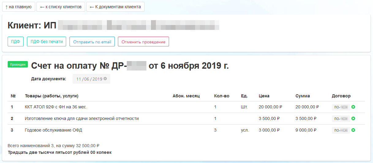 До переноса документа в архив, проведение счета можно отменить и выполнить нужные исправления. Подготовленный счет можно отправить клиенту в виде pdf-документа по электронной почте
