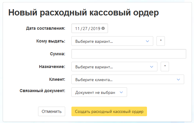 Иногда в работе возникает необходимость выдать сотруднику из кассы предприятия средства. Причины могут быть разными, например: "Расходы", "Технический план", "Заработная Плата", "Изготовление печати", "Командировка Камчатка", "ГСМ", "Услуги курьерской компании", "Загородный обед", "Парковка", "Почта", "Офисные расходы", "Покупка оборудования".