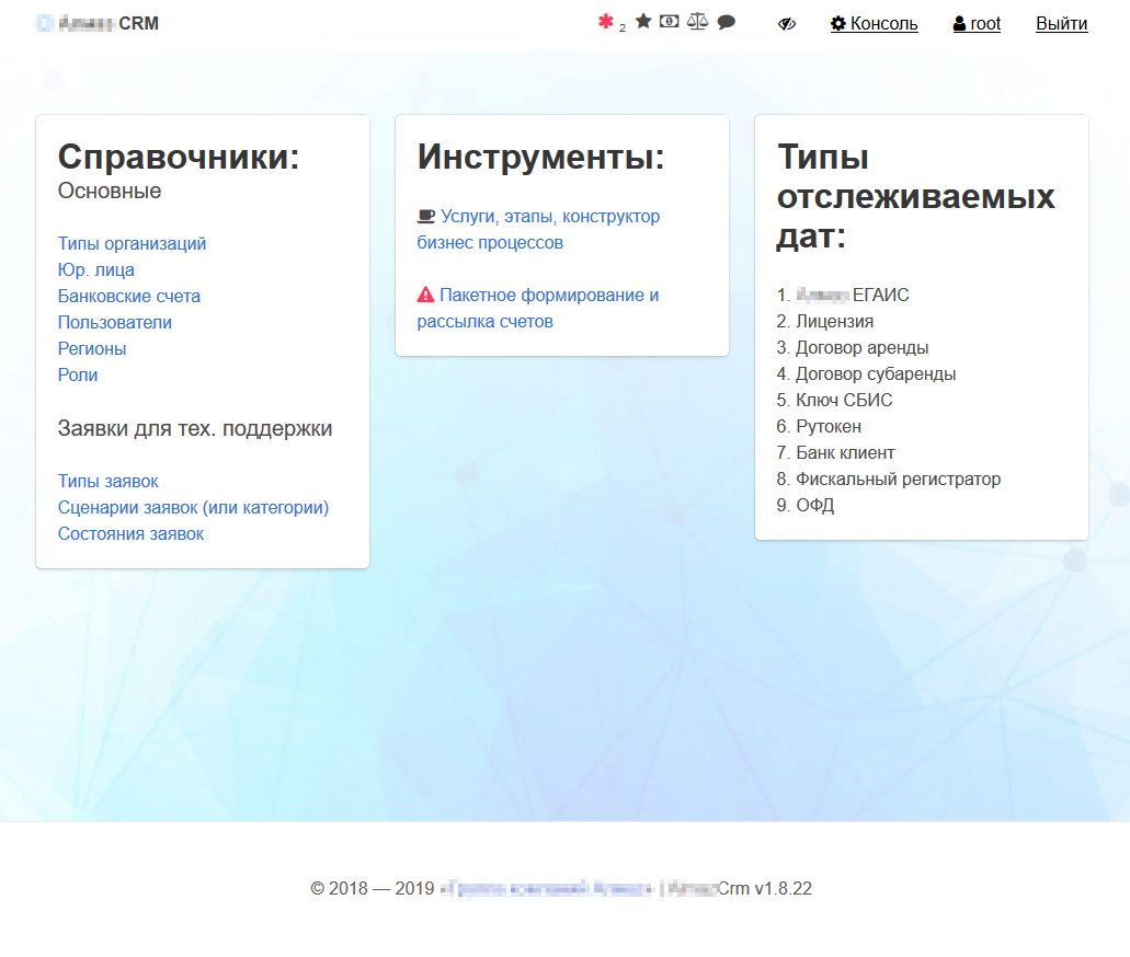 Ядро отвечает за работу базовых подсистем приложения: управление пользователями, разграничение доступа, построение навигации по разделам, просмотр списков и отдельных элементов, возможность создавать, редактировать, удалять и восстанавливать различные объекты системы.